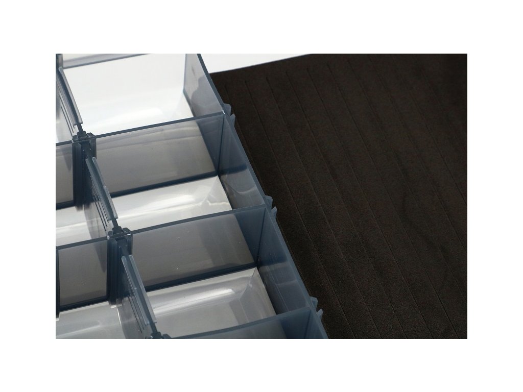 Krabička kombinujúca klasické priehradky na nástrahy s penovou vložkou pre umiestnenie jigových hlavičiek alebo zapichnutie iných nástrah. Rozmer: 27,5x18,5x4,5 cm.