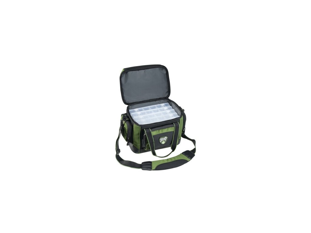 Priestranná taška na nástrahy a všetko príslušenstvo na lov na prívlač. Obsahuje 5 veľkých krabičiek na nástrahy. Veľké vrecko vo veku a tri postranné vrecká umožňujú prehľadné uloženie ďalšieho príslušenstva. Popruh cez rameno s kvalitným polstrovaním zaručuje pohodlné nosenie.