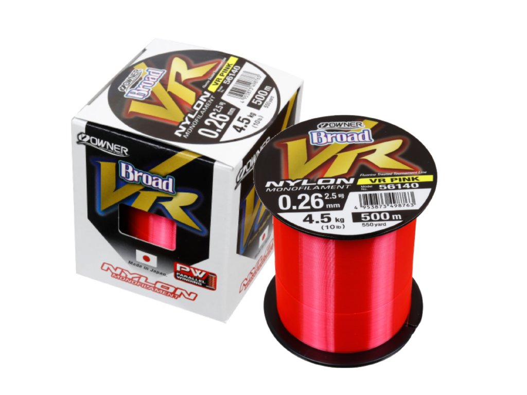 Kvalitný nylonový vlasec Owner Broad VR japonskej výroby. Špeciálne farebné prevedenie PW Pink zaručuje tomuto vlascu, že pod vodnou hladinou je skoro neviditeľný a teda je vhodný aj pre lov v studenom období, kedy sú ryby opatrné a nedôverčivé. Vlasec má nízku roztiažnosť a slabé pamäťové vlastnosti, takže krútenie sa znižuje na minimum. Špeciálna povrchová úprava a Japonské technológie pri výrobe nylonov a šnúr zaručujú vysokú oderu-vzdornosť a pevnosť v uzle. Návin na cievke : 500 m.